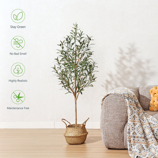 Faux Olive Tree 5FT – Tall Artificial Plants Indoor with Real Wood Trunk & Seagrass Basket, Lifelike Silk Leaves & Fruits – Potted Large Fake Trees for Home, Living Room, Bedroom & Office Decor
