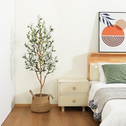 Faux Olive Tree 6FT – Tall Artificial Plants Indoor with Real Wood Trunk & Seagrass Basket, Lifelike Silk Leaves & Fruits – Potted Large Fake Trees for Home, Living Room, Bedroom & Office Decor