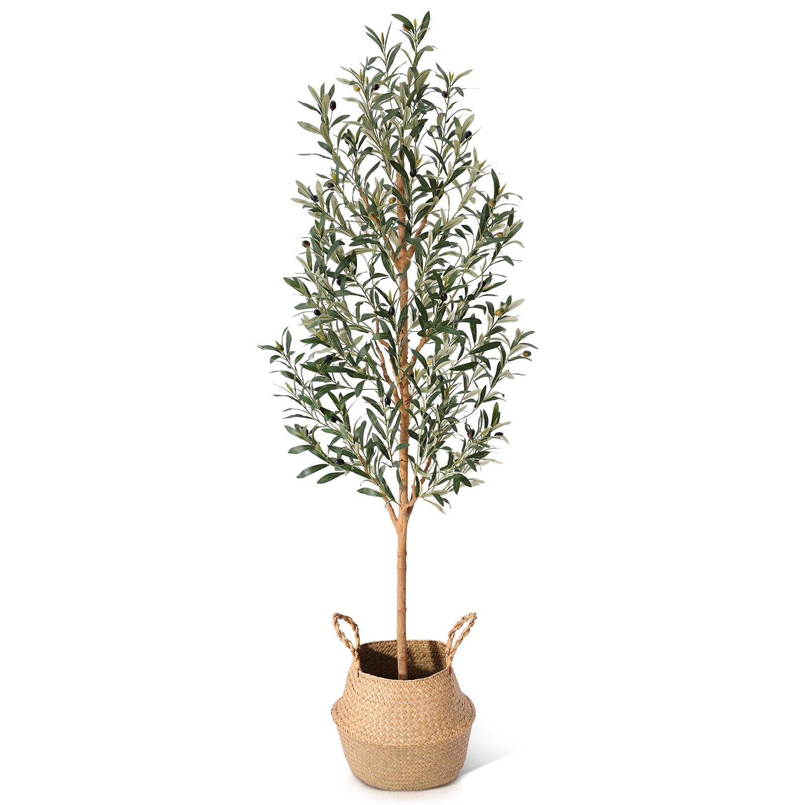 Faux Olive Tree 6FT – Tall Artificial Plants Indoor with Real Wood Trunk & Seagrass Basket, Lifelike Silk Leaves & Fruits – Potted Large Fake Trees for Home, Living Room, Bedroom & Office Decor
